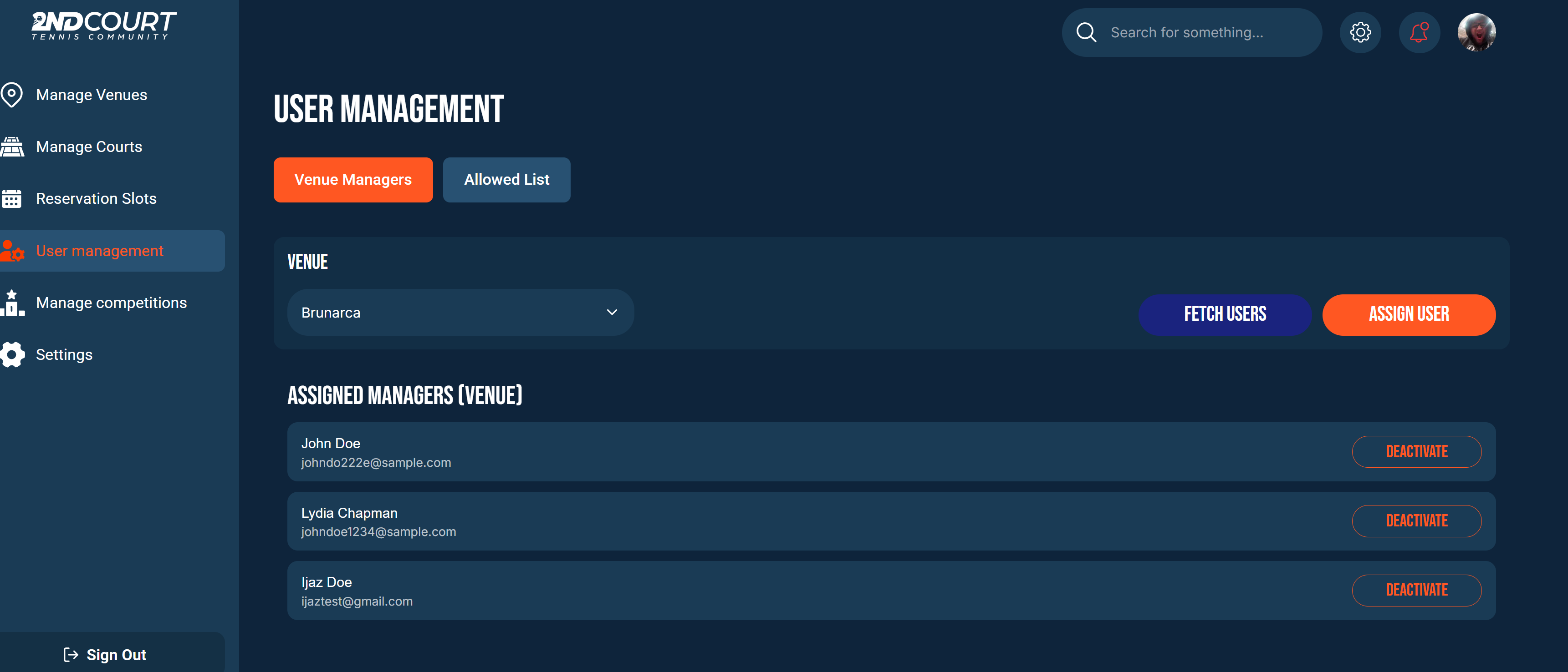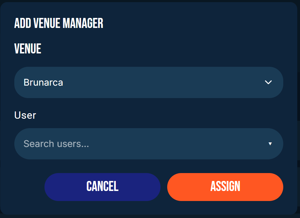 - Click “ASSIGN” — the selected user will now be set as a Venue Manager
